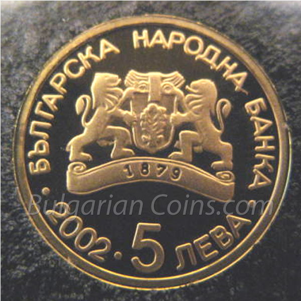 Лице:На лицевата страна на монетата е изобразена емблемата на БНБ с година "1879", изписана върху лентата. Околовръст е изписано "Българска народна банка" и номиналната стойност "5 лева", а годината на емисия "2002" е разположена над емблемата.